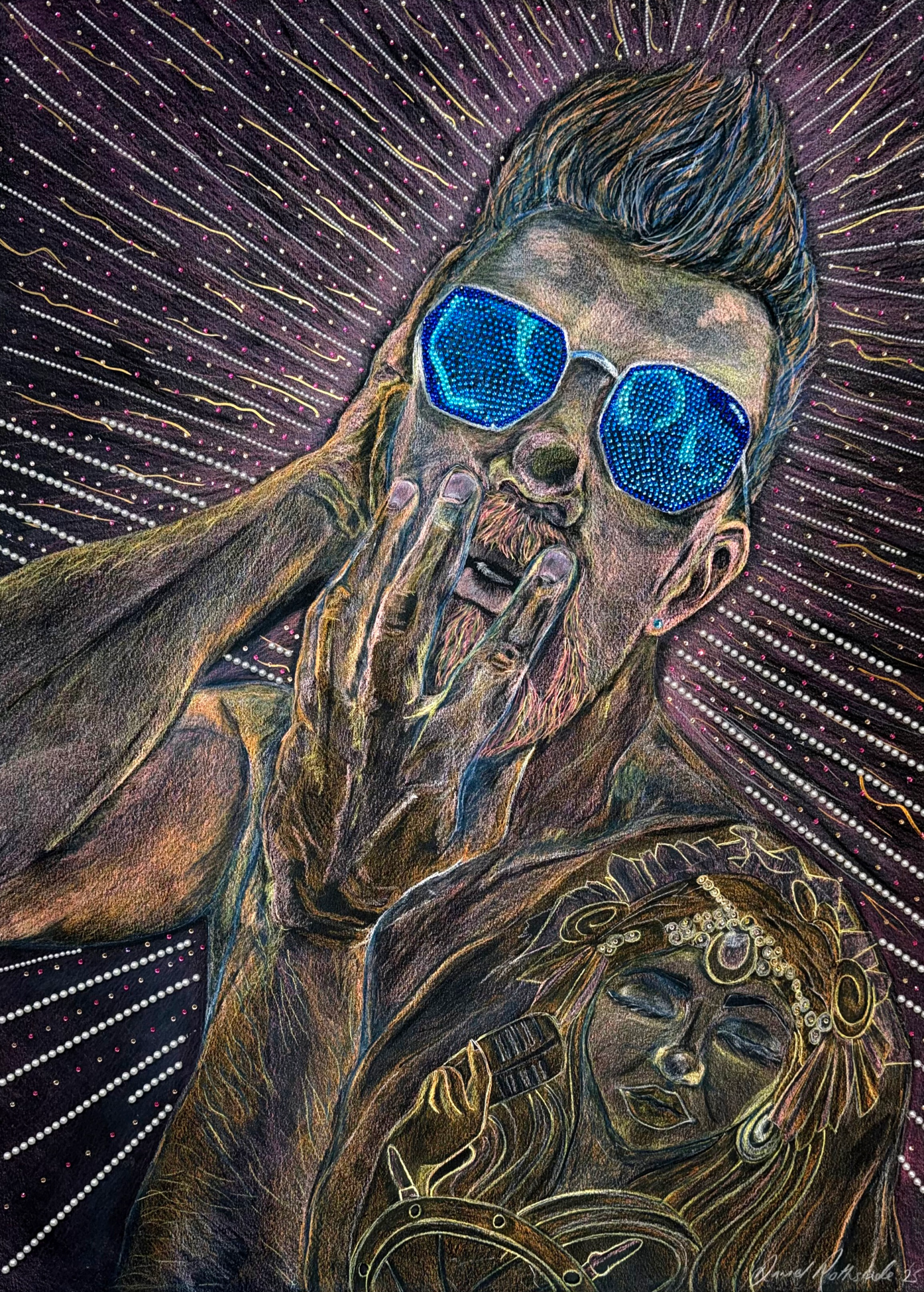 Pencil and pastel on black paper with gemstone embellishments. A1.