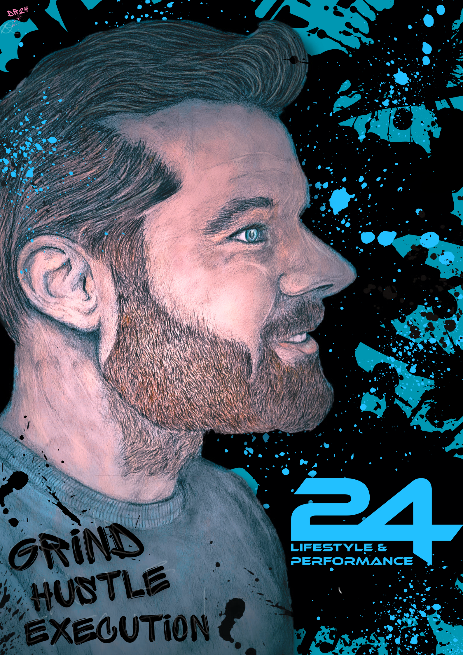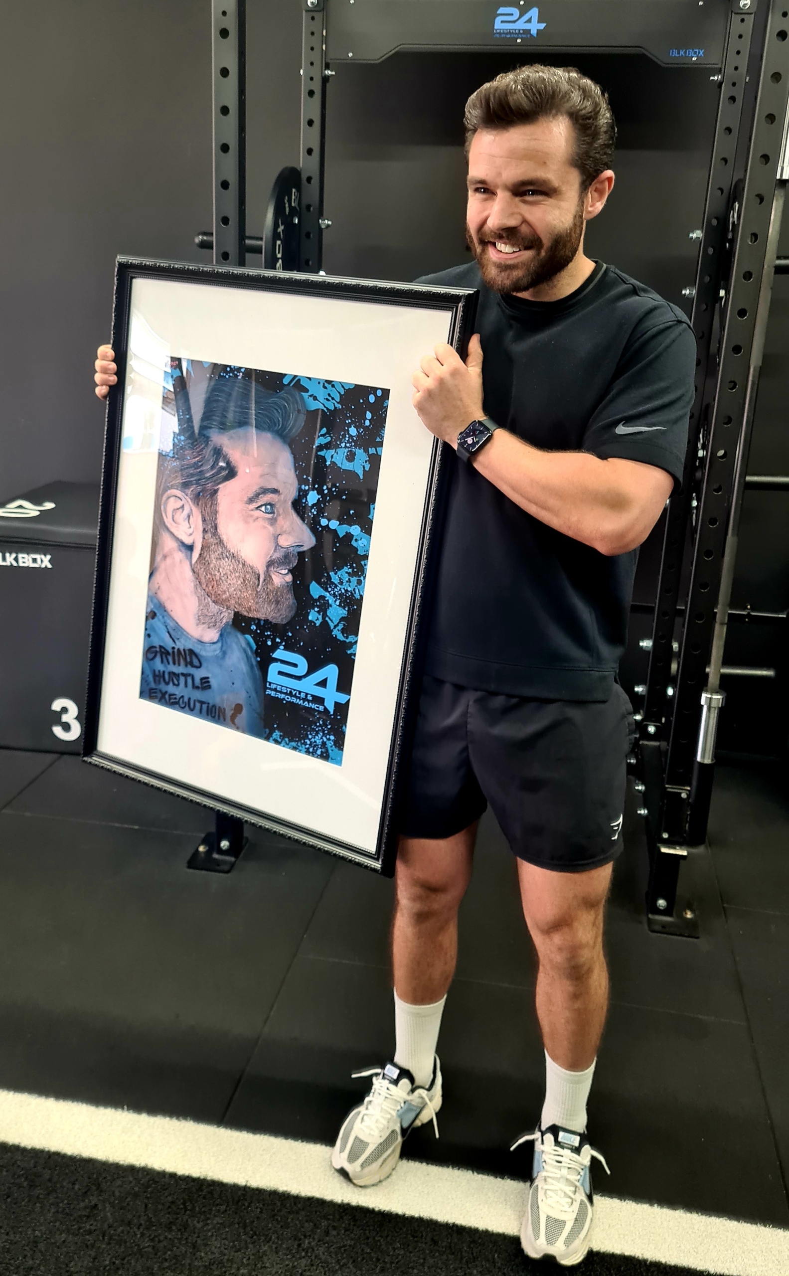 Trust The Process is Jeff’s mantra for success. Grind, hustle and execution speak to how anything meaningful is achieved in life – whether that’s physical results or opening your own business. That mindset quickly became a central part of the piece, shaping both the energy of the portrait and how the brand’s colours, logo and overall vibe were woven into the work.